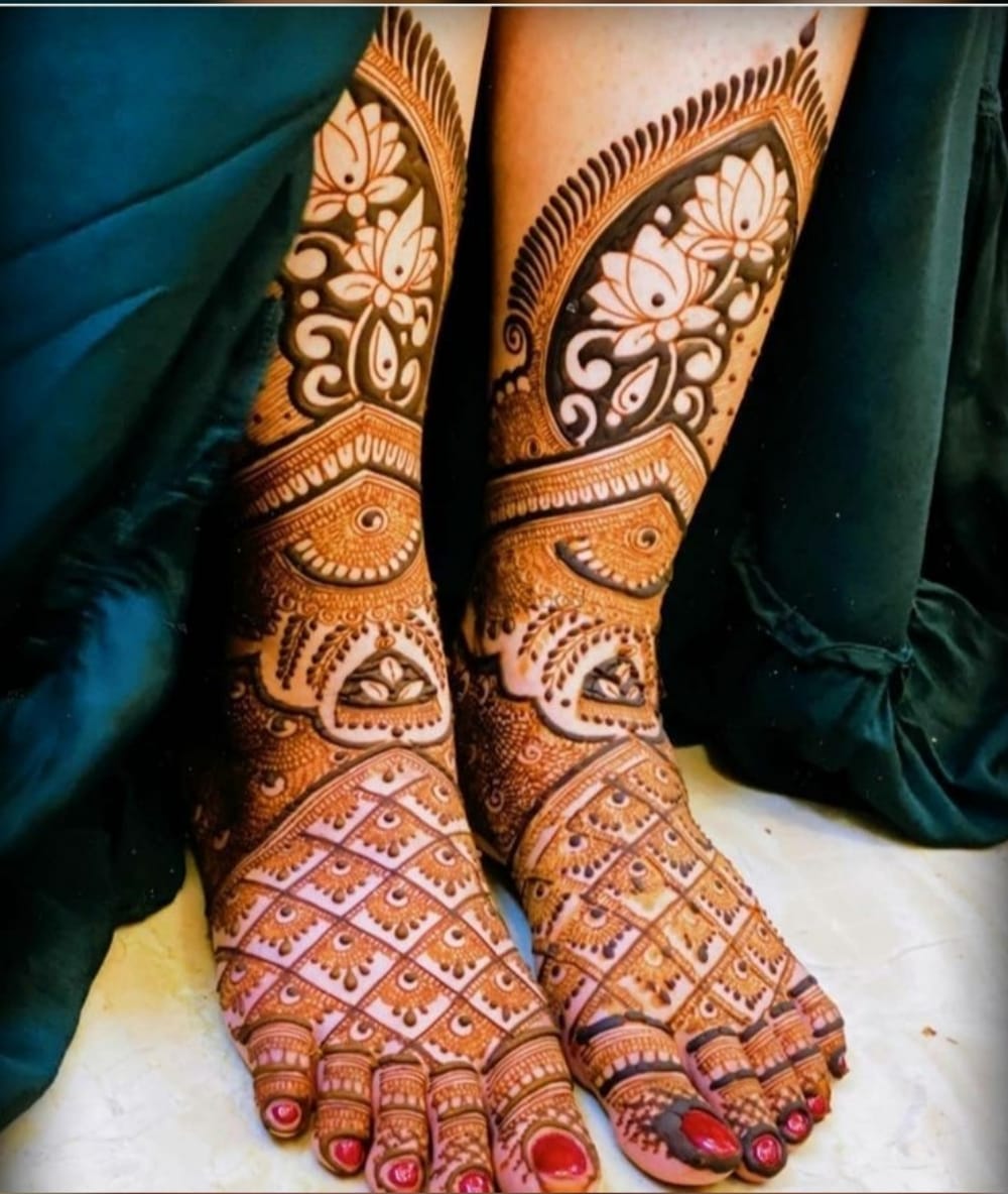 Elegant Bridal Mehndi package with full-hand and feet designs. Using 100% natural henna for a rich, dark stain. Special offer – ₹5100 only.