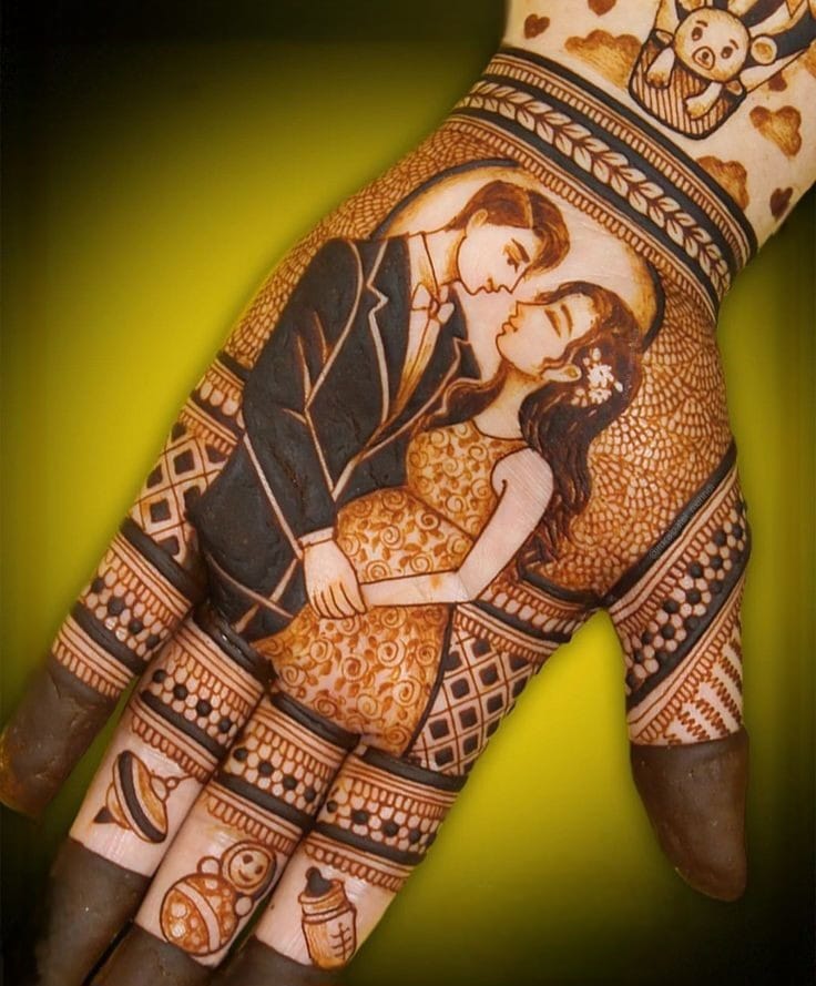 A beautifully crafted mehndi design showcasing a couple’s portrait, representing love and togetherness. This unique artwork highlights the artistic side of mehndi, blending traditional detailing with modern romantic themes. It is part of our Demo Collection, created for showcasing skill and creativity, not for regular bookings.