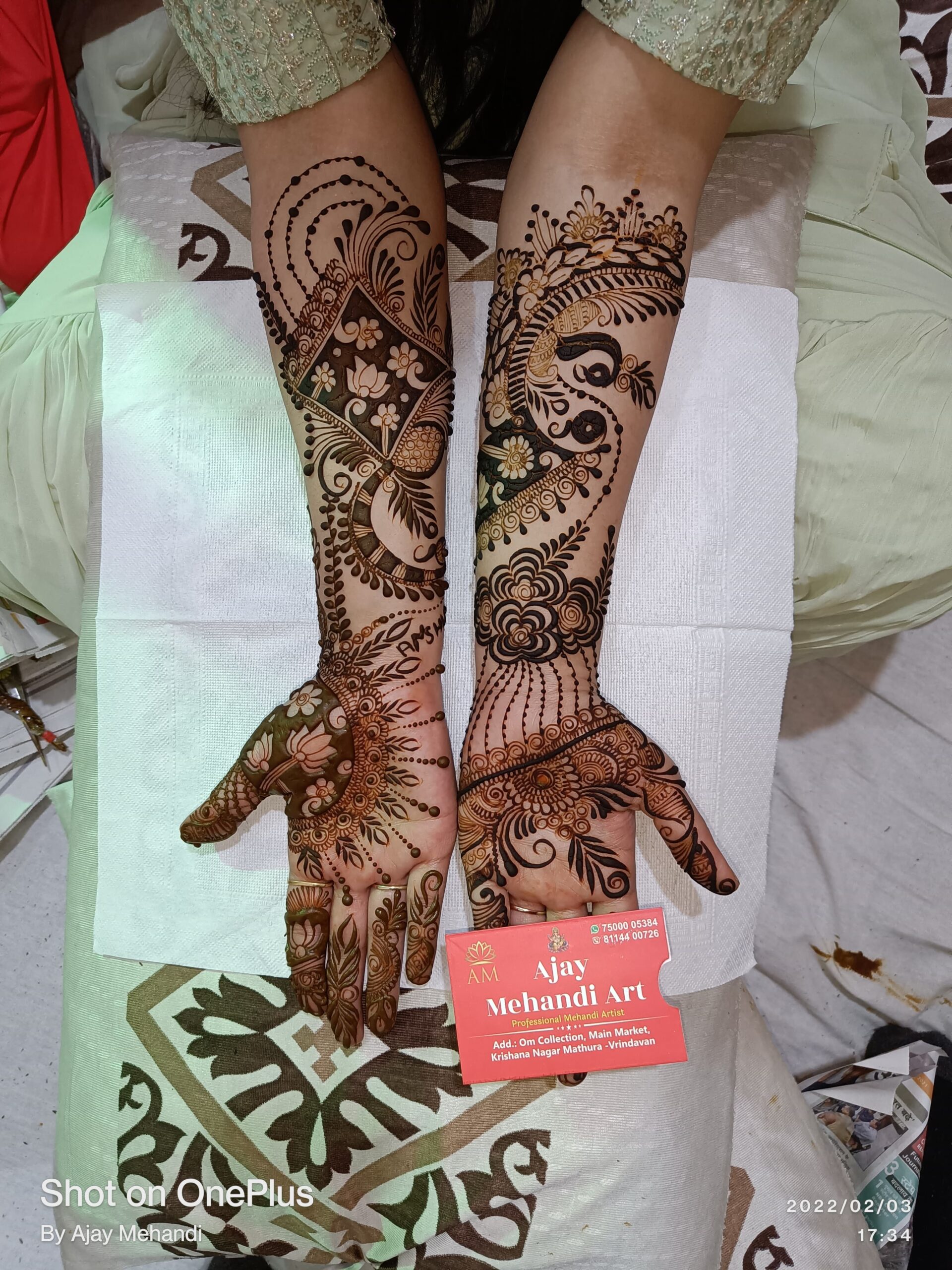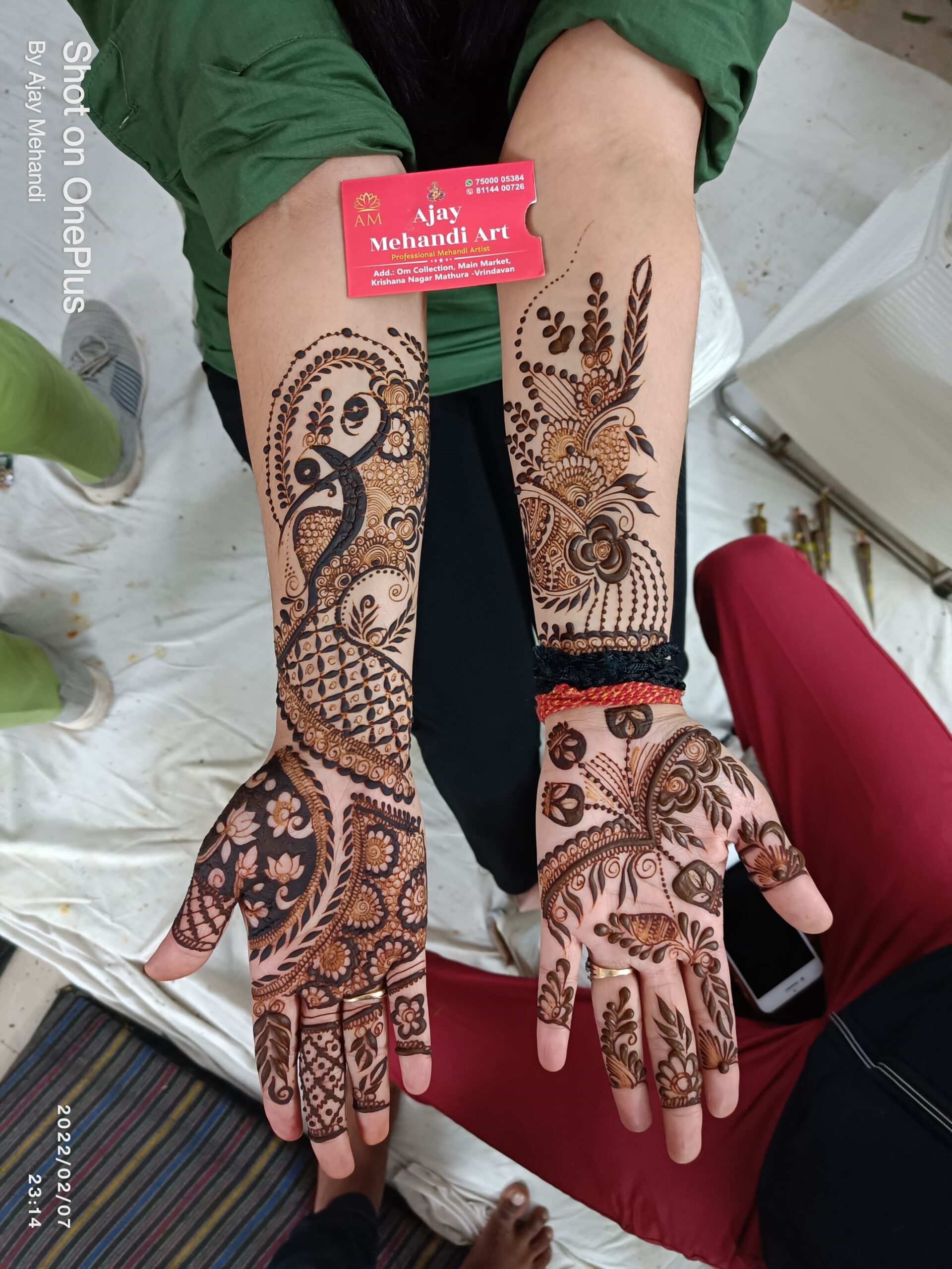 A stylish Indo-Western mehndi design combining traditional motifs with modern Arabic patterns. The front hand is filled with detailed floral and peacock elements, while the back side features an elegant Arabic style for a complete fusion look. Perfect for weddings, parties, and festive occasions.