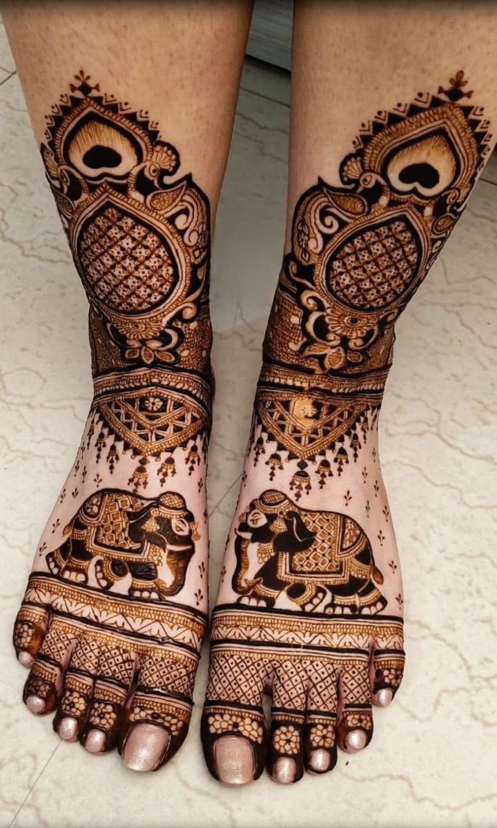 This elegant bridal mehndi design brings a blend of floral, geometric, and royal elements crafted with precision. The full-hand patterns feature traditional motifs, intricate detailing, and cultural elements, while the feet showcase classic elephant and mandala-inspired designs. Perfect for brides who want a regal and timeless mehndi look on their big day.
