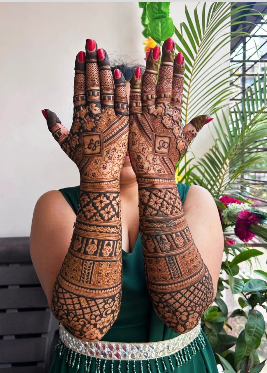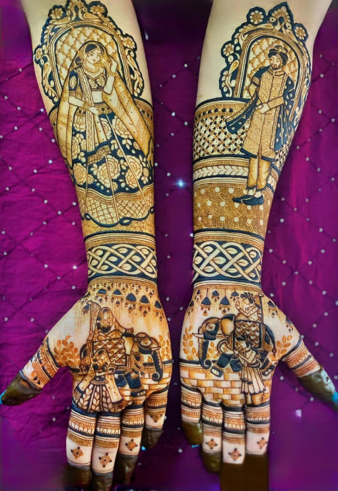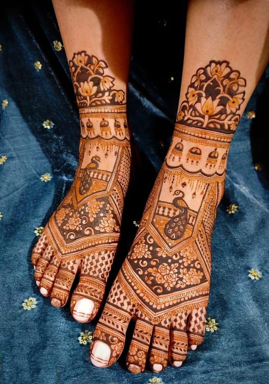 Luxurious full-hand and foot mehndi with intricate royal patterns, portraits, and motifs. Perfect for brides who want a regal look.