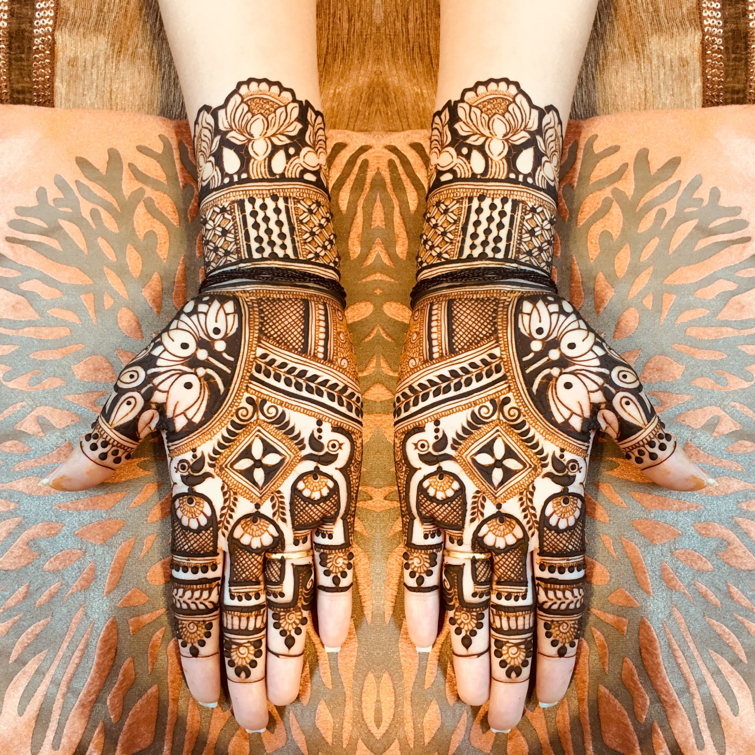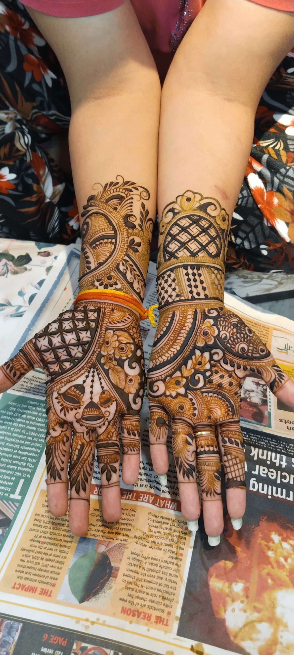 This elegant bridal mehndi design combines intricate Indian patterns on the front with bold Arabic styling on the back. Crafted with fine floral, paisley, and geometric detailing, it gives a perfect traditional yet trendy look. Ideal for brides or special occasions who want full-hand beauty at an affordable price.